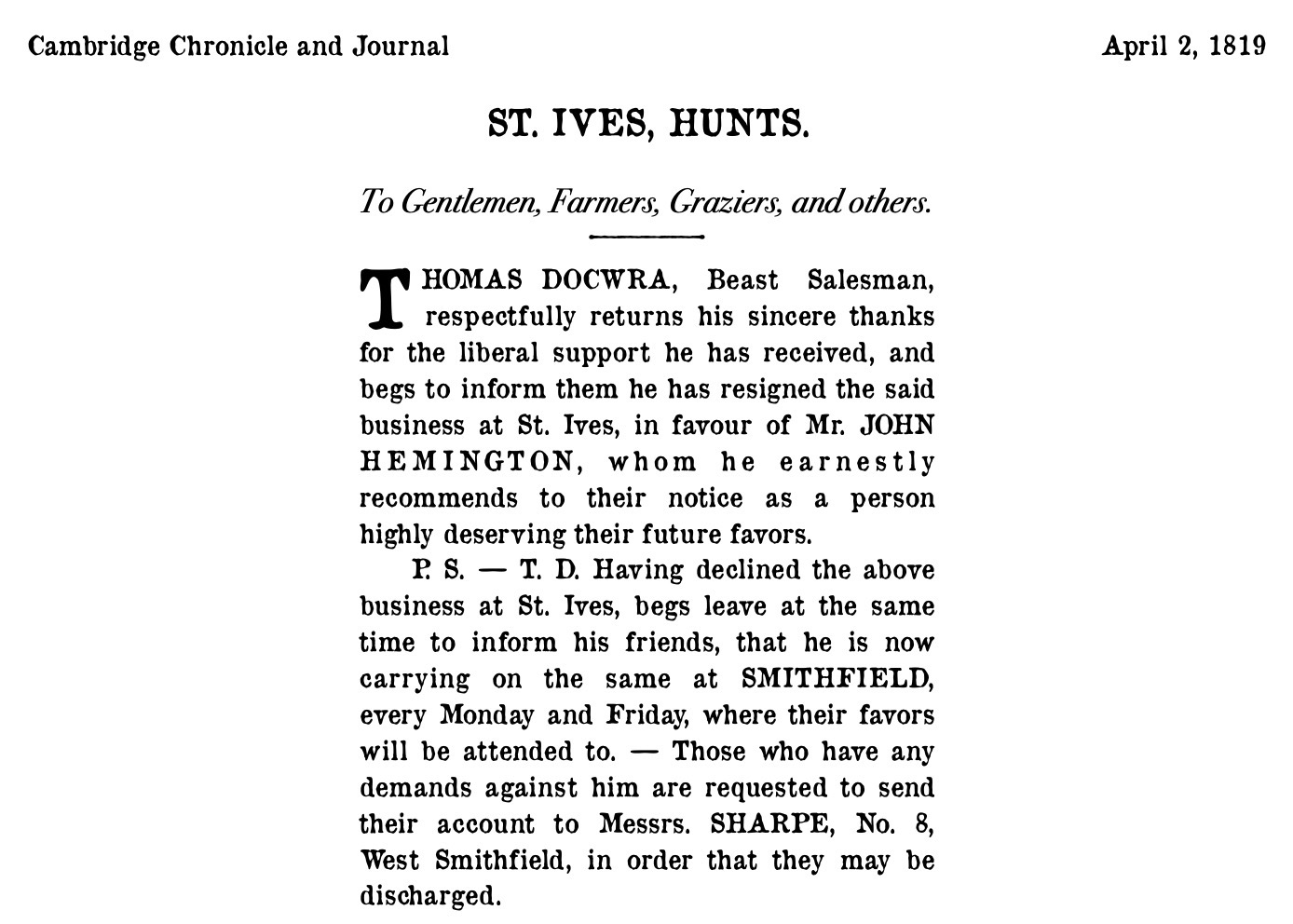 St Ives 100 Years Ago St Ives 2 April 1819