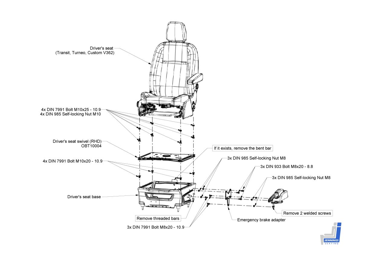 Ford Transit Mk8/Custom V362 Seat Turntable Swivel - Driver Side. Item out of stock. Please call for accurate lead time. This is a heavy duty, low profile seat swivel base for a Ford Transit Mk8/Custom. Complete with fixings and handbrake lowering kit. Designed and manufactured from the Jennings Navigator range these swivels carry a TUV approval.