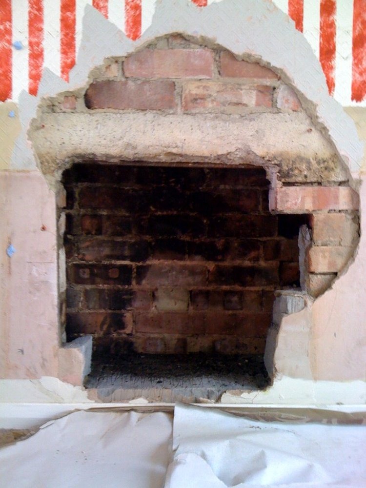 If it is missing, it will need to be rebuilt. 4. Carefully remove the plaster. Start by carefully chopping off the plaster from the assumed centre of the fireplace, working outwards, and the outline of the opening will become apparent. It should be spanned by a lintel, which must be left in place.